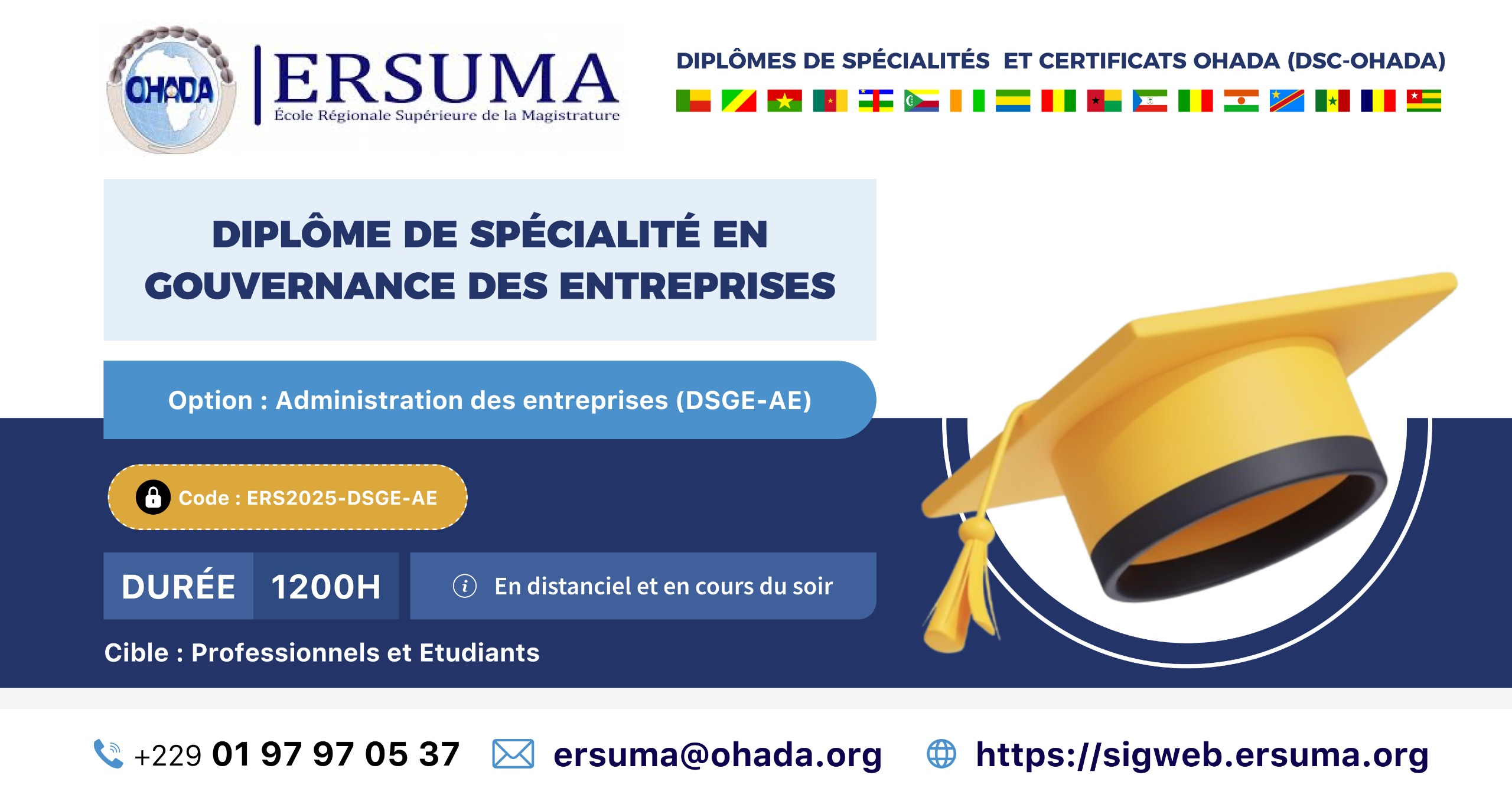 Le Diplôme de spécialité en Gouvernance des entreprises option administration des entreprises (DSGE-AE) comprend d’une part les cours magistraux et pratiques en gouvernance, administration, stratégie de communication en entreprise, et d’autre part les modules de méthodologie de recherche, de rédaction et de soutenance de mémoire, rapport ou dossier.